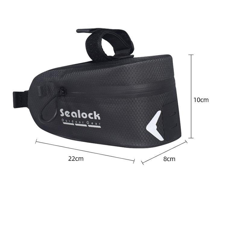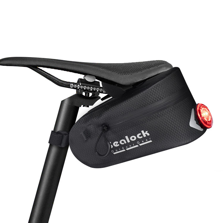 Sykkelsadelposen er laget av vanntett stoff og har glidelås for en glidelås for å forhindre at vann kommer inn gjennom glidelåsen. Men ikke suge på lenge, da glidelås ikke er helt vanntette og vann kan sive inn i sømmene.
